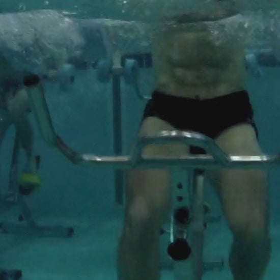 Fabricada en acero inoxidable AISI 316L, integra panel informativo de ejercicios, pedales con tratamiento antibactericida y componentes axiales del mismo material que aseguran resistencia excepcional en entorno acuático.